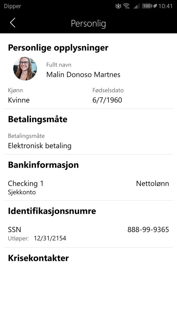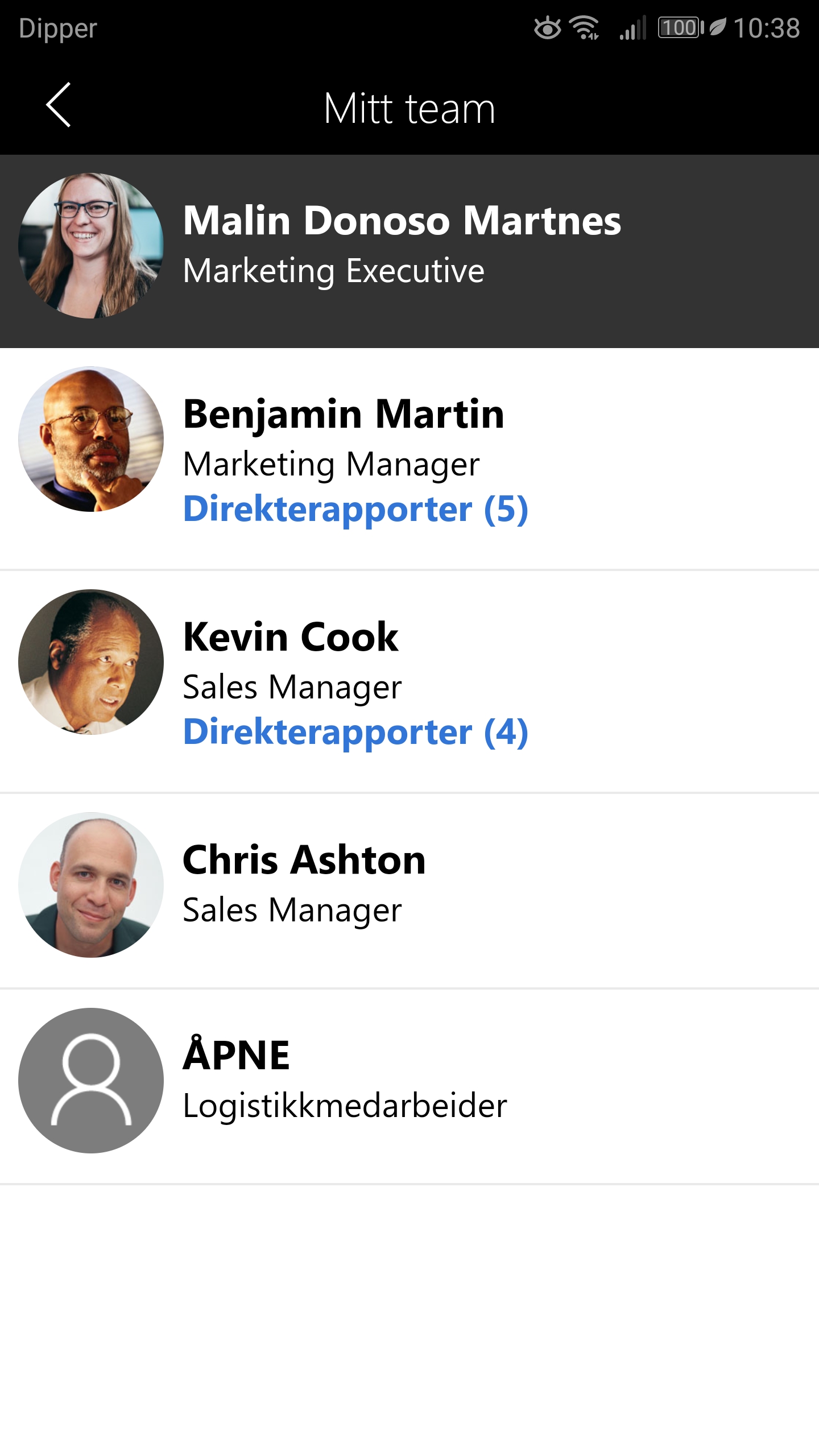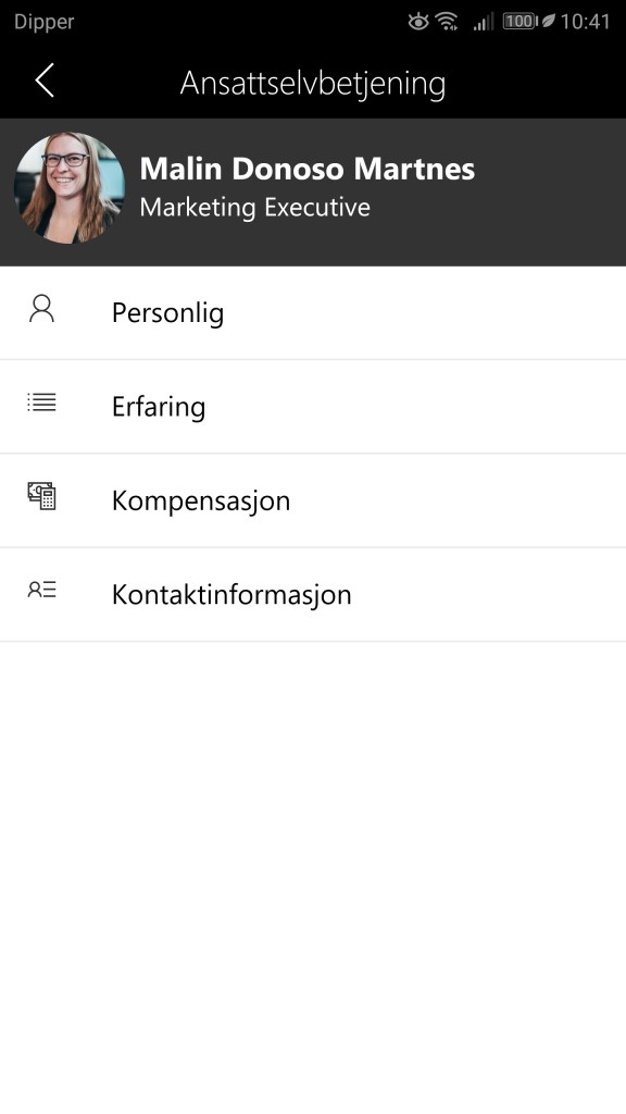 To use the app you have to download the app “Microsoft Dynamics 365 Unified Operations”. From there you log on to your environment and you get three choices as a standard, the same three you just published; “My team”, “Company Directory” and “Employee Self Service”