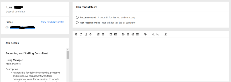 A new site opens where you say if you would recommend or not recommend the candidate for the job and write a description on why you would or wouldn’t recommend the candidate.