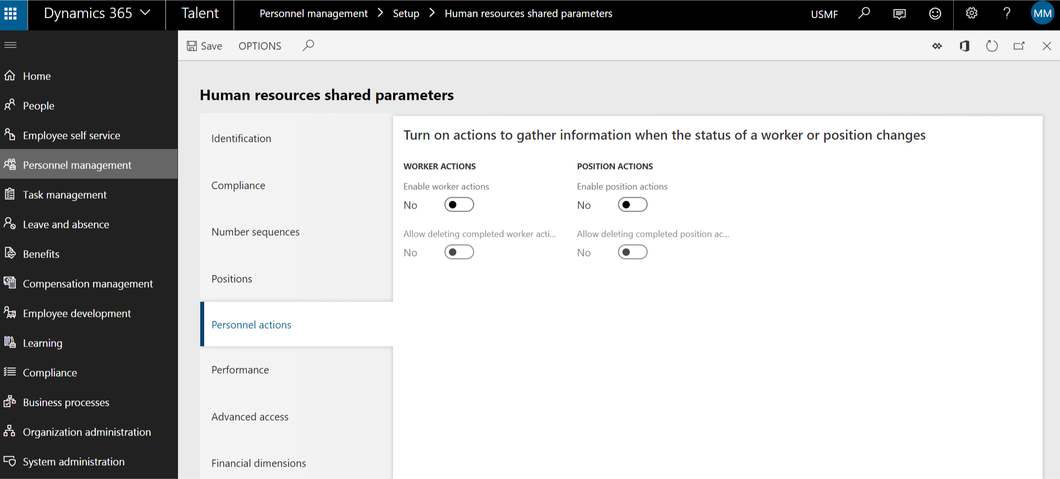 To use personnel actions you first need to activate worker and or positions actions in the human resources shared parameters -> personnel actions.