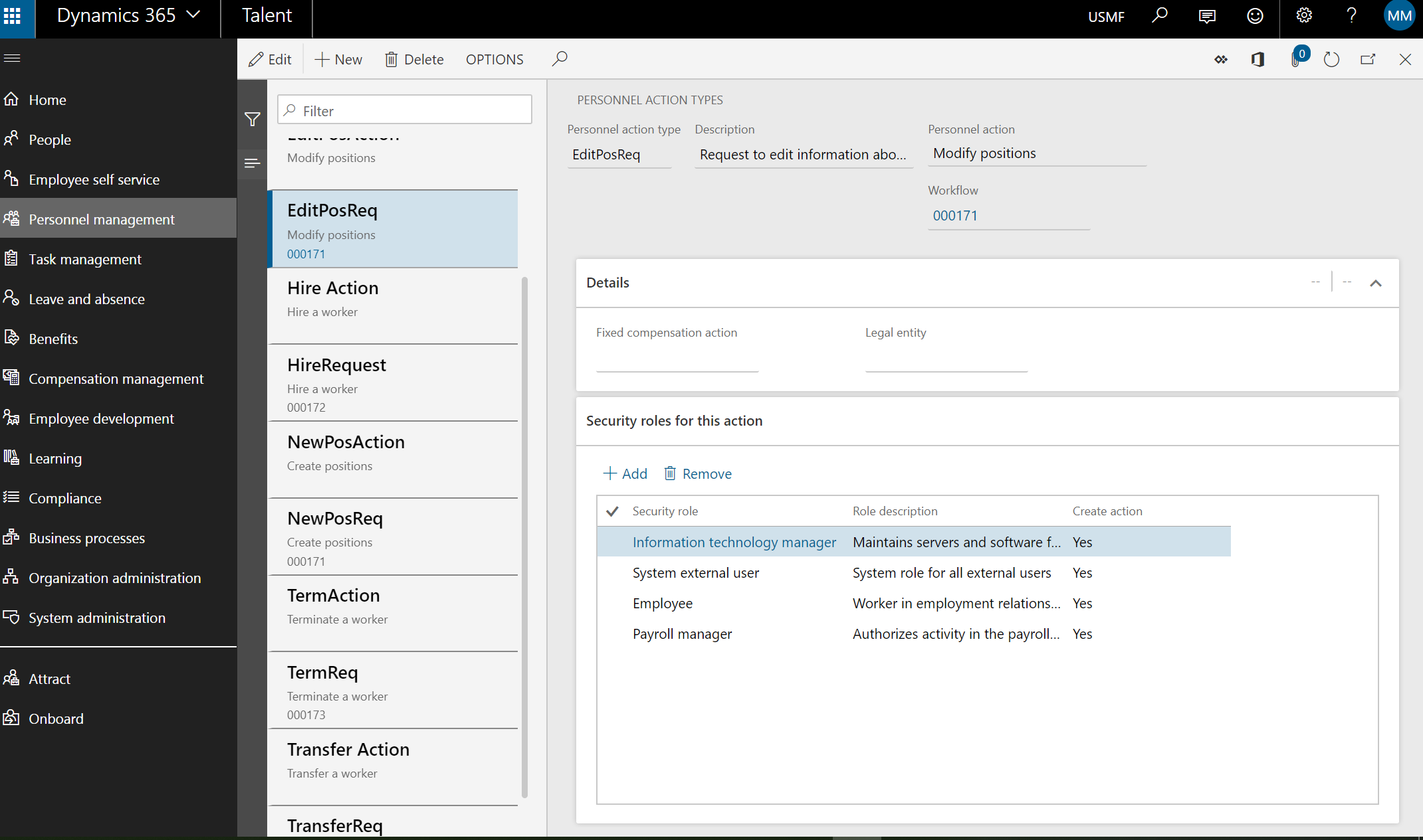When you have activated the actions, you can go to personnel management and see the activated actions types or add new personnel action types.