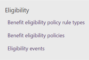 Benefit eligibility policies you set up with name and set which organization the policy should apply to and connect them to the policy rules.