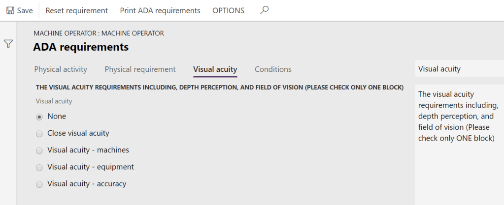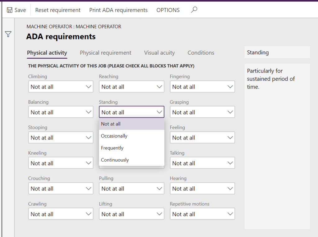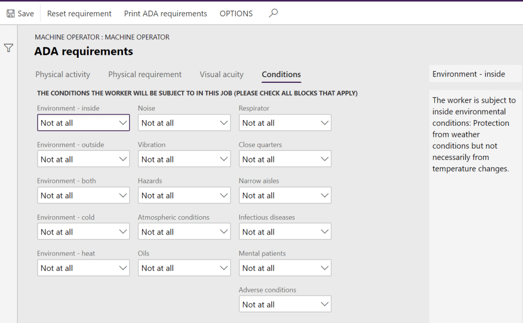 When you now go to Organization administration -> Job Templates you will find ADA in the action pane. When you click that you go to the ADA requirements page where you can set the requirements for the job template.
