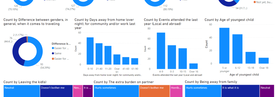 My only issue is that I’ve never created a Power BI rapport, but that’s a great reason to learn! So I exported the data from Forms Pro to Excel, did some editing (the two questions about “What’s the worst about being away from home?” needed some editing to work the way I wanted).