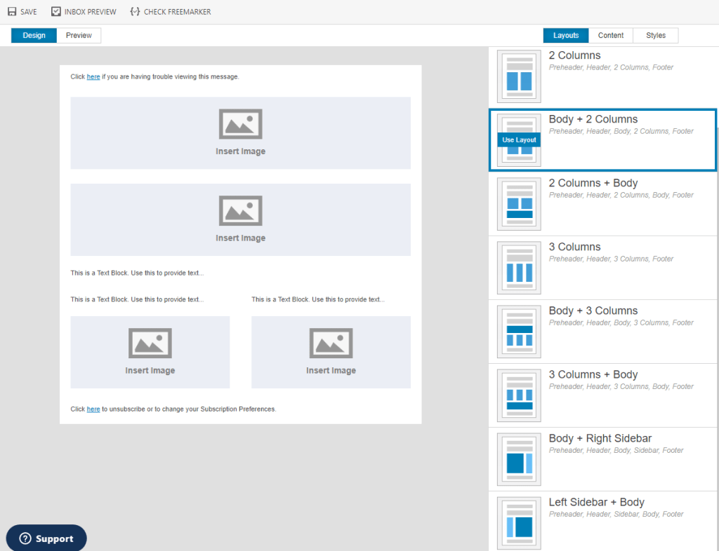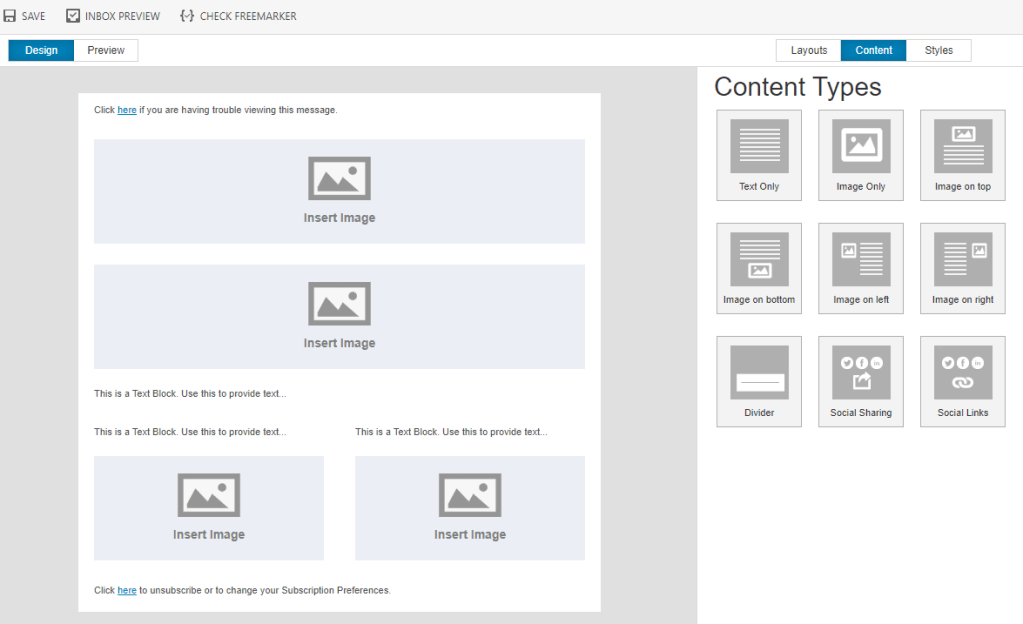 The Free Style editor is a WYSIWYG (what you see is what you get) editor. It’s very easy to use, but it also requires some work to get it looking good. In this you can also edit the HTML if you want. You can also use Freemarker and personalisation.