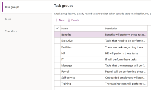 A task group lets you classify related tasks together. When you add tasks to a checklist, you can filter the list of all tasks by Task group, for example HR tasks, Payroll tasks or IT tasks.