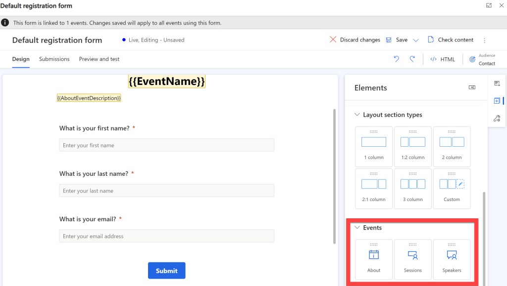 When you’re in edit mode, you’ll see the event information you can add to the form. To add your sessions to the form, drag the “Sessions” box to the form.