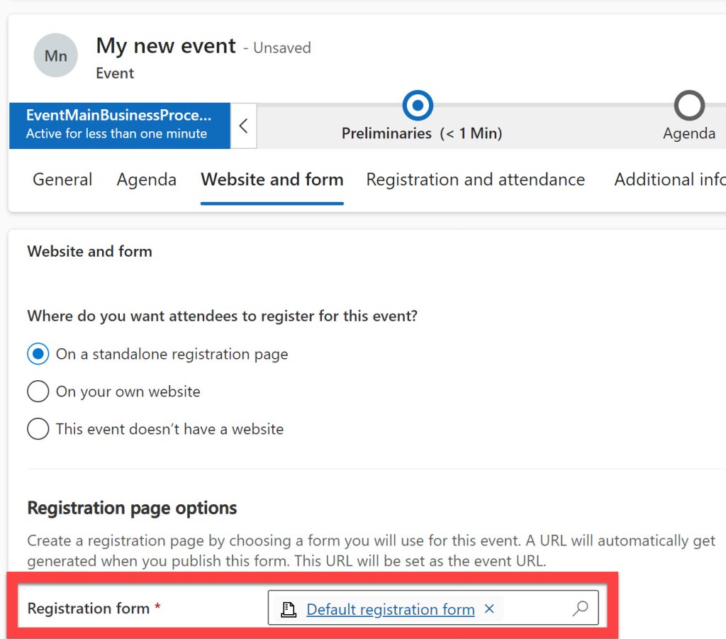 You’ll find the registration form under the tab “Website and form”, the default registration form will automatically be added, but you can change it to your own form if you want.