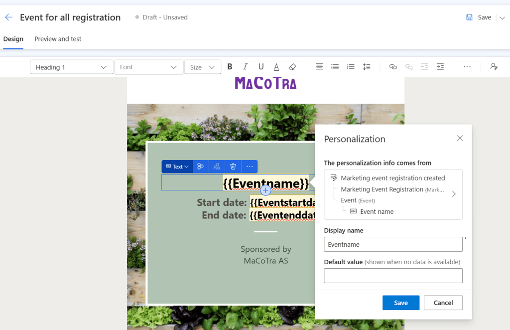 I want to keep most of the personalizations, but I want to add a teams event button for the online events. I add a link to “Teams meeting”, I then select “From other source” and select the same path as before and select from the event. This gives each participant their own unique URL to join the event. As long as the attendee joins this meeting maximum 120 min before the event, they are registered as checked-in.
