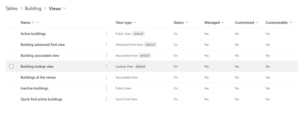 Go to make.powerapps.com and select the view you want to edit (through solutions, don’t go rogue!). I’ve selected “Active buildings”.